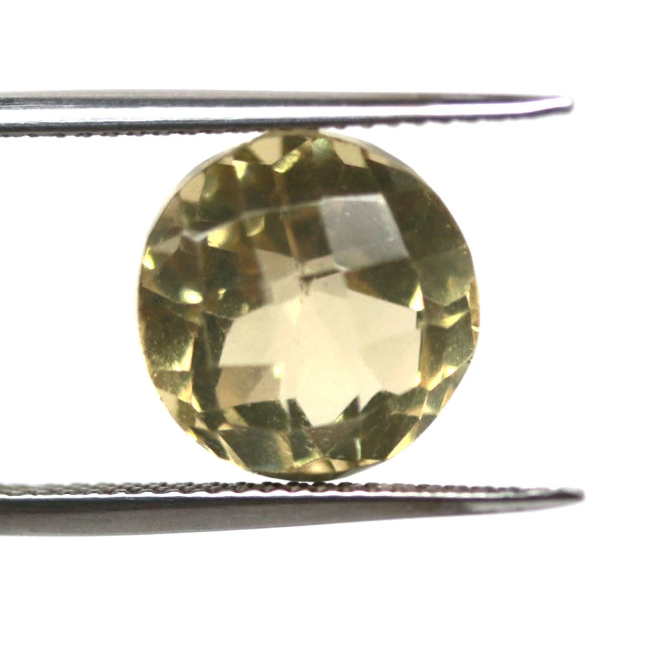 5.80 karátos, kerek formájú, sakktábla csiszolású, természetes citrin drágakő. Mérete: 11 x 8.3 mm.