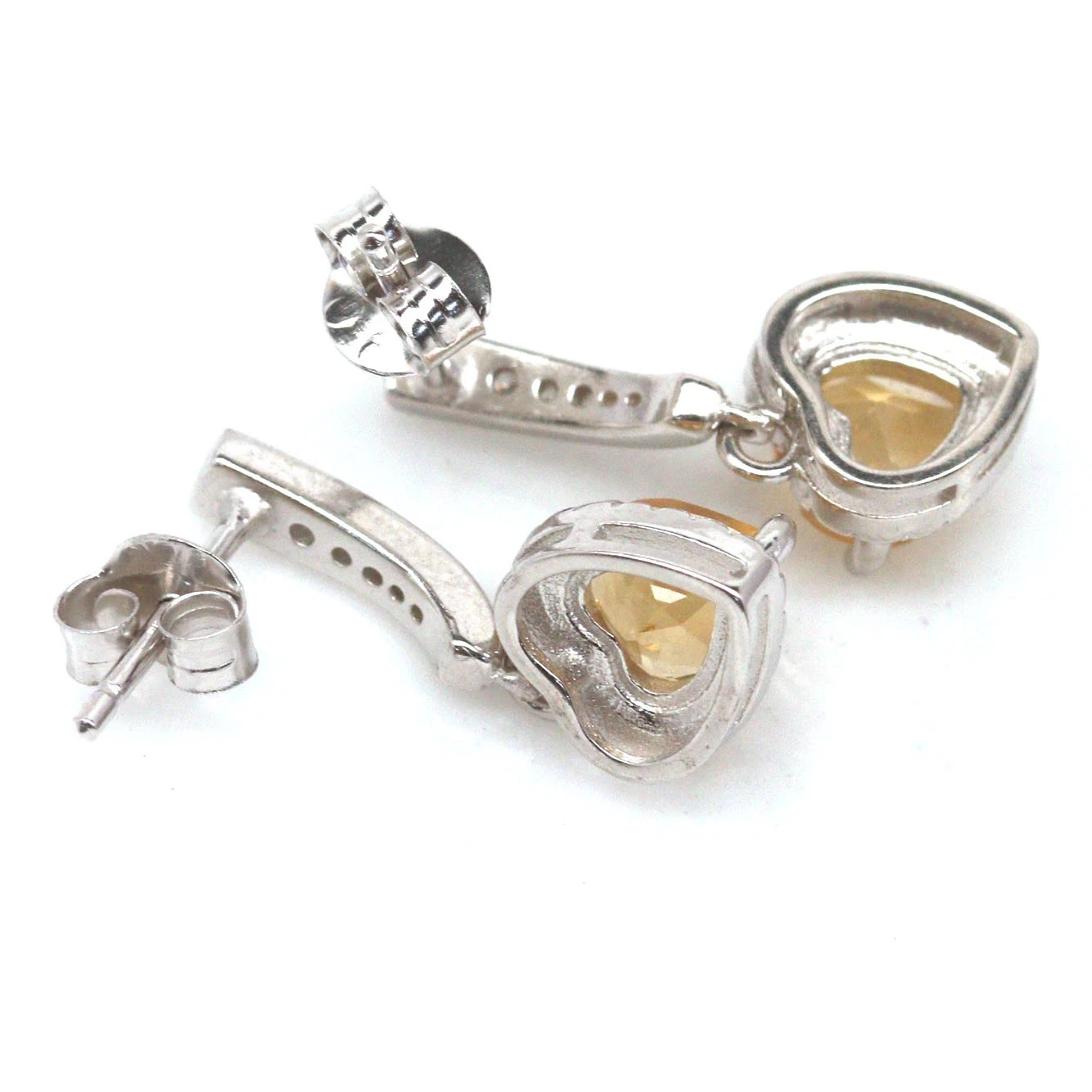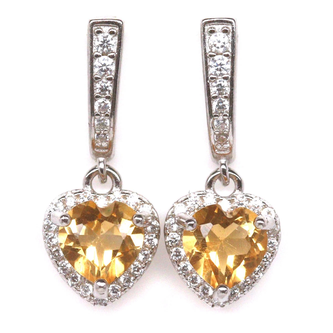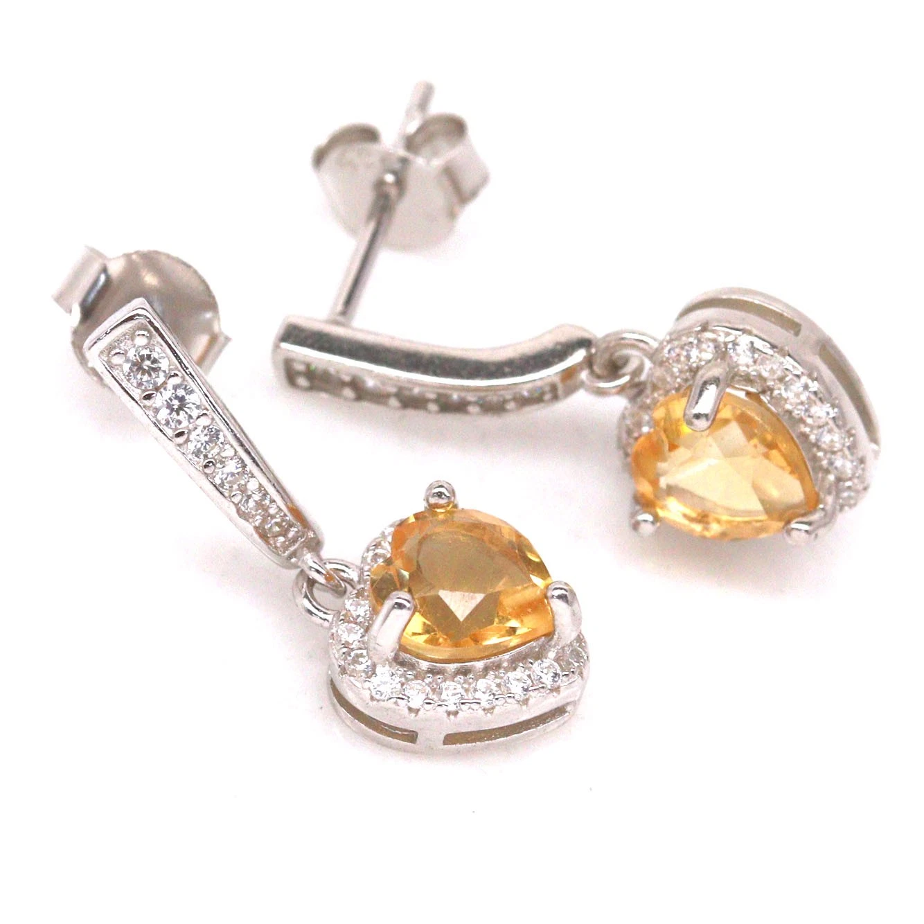 925-ös finomságú ezüst fülbevaló, 6 mm-es szív alakú, természetes citrin drágakővel és természetes, fehér cirkon drágakövekkel. Az ékszer kézzel készített. Beszúrós kivitel. Mérete: 8.4 x 21 mm.
