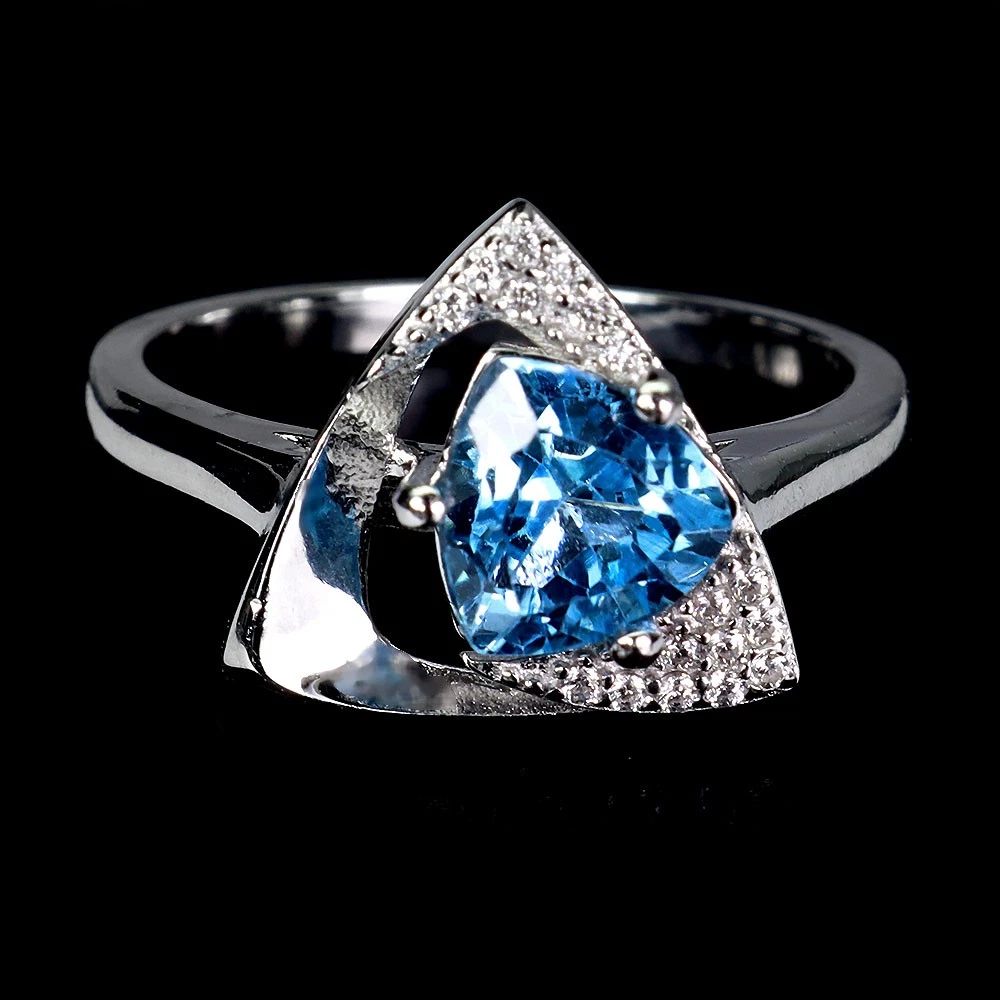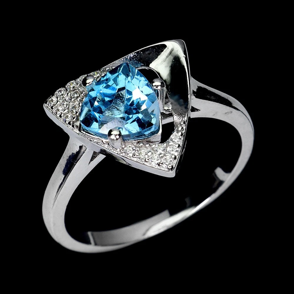 925-ös ezüst gyűrű 7 mm-es, háromszög alakú, természetes (kezelt), svájci kék brazil topázzal. Az ékszer 14 karátos fehér arannyal van bevonva.