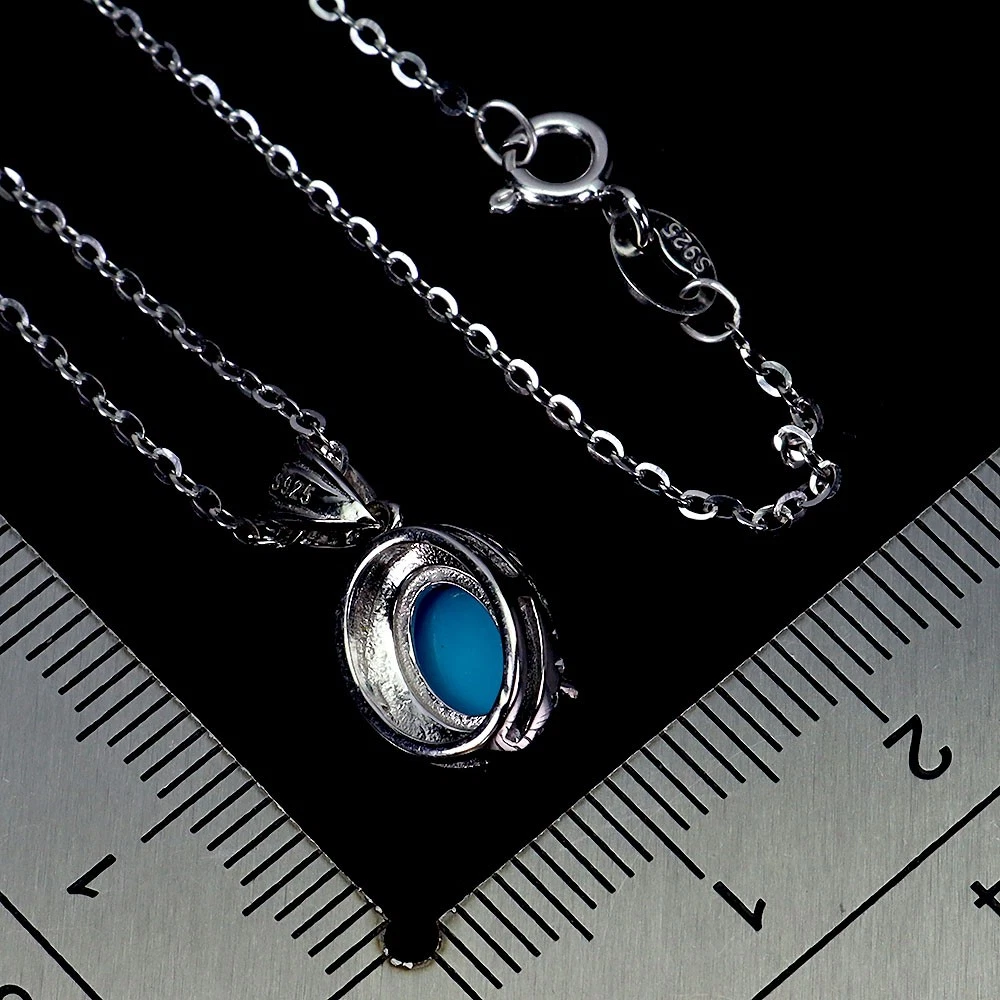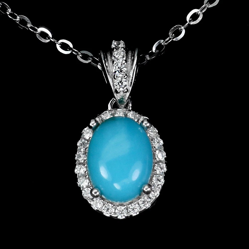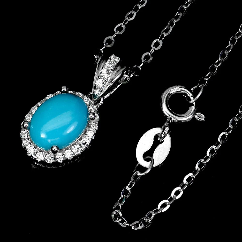 925-ös finomságú ezüst medál 8 x 6 mm-es, természetes, ovális alakú, kaboson csiszolású türkíz drágakővel. Az ékszer 14 karátos fehér arannyal van bevonva.
