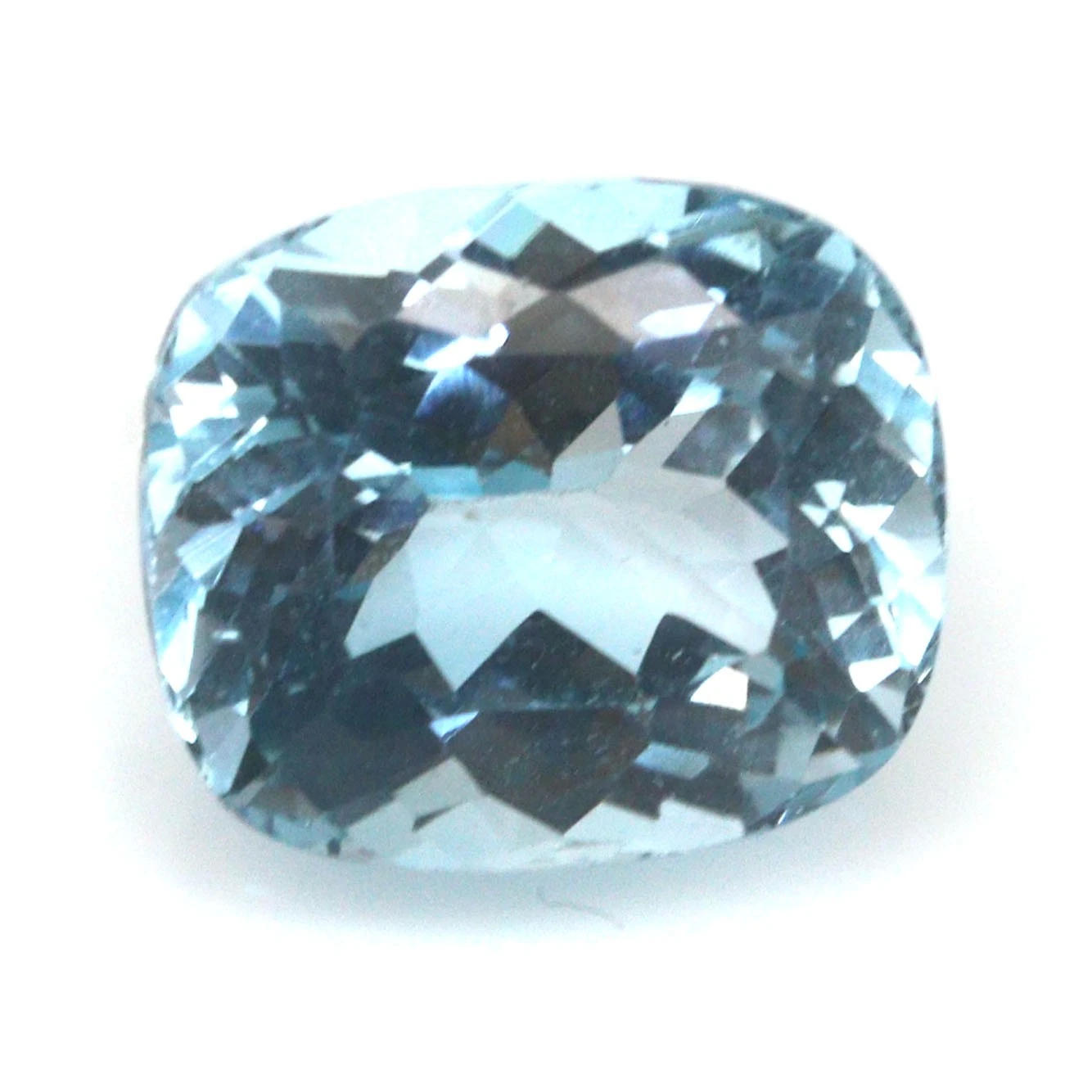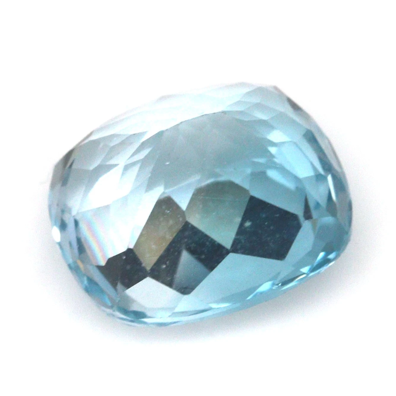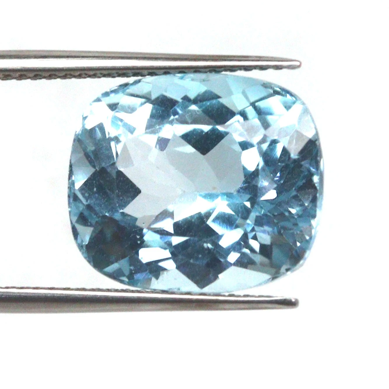 13.09 karátos, antik formájú, briliáns csiszolású, természetes, kezelt égszínkék topáz drágakő. Mérete: 12.1 x 14.2 x 9 mm.