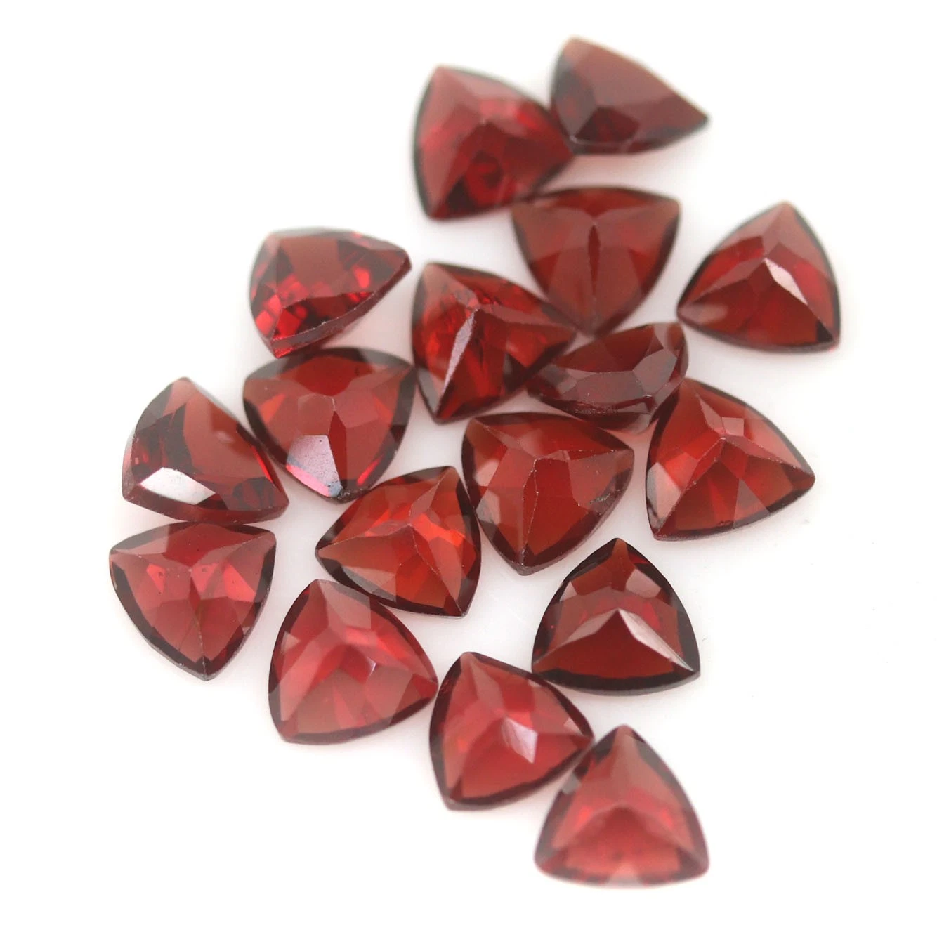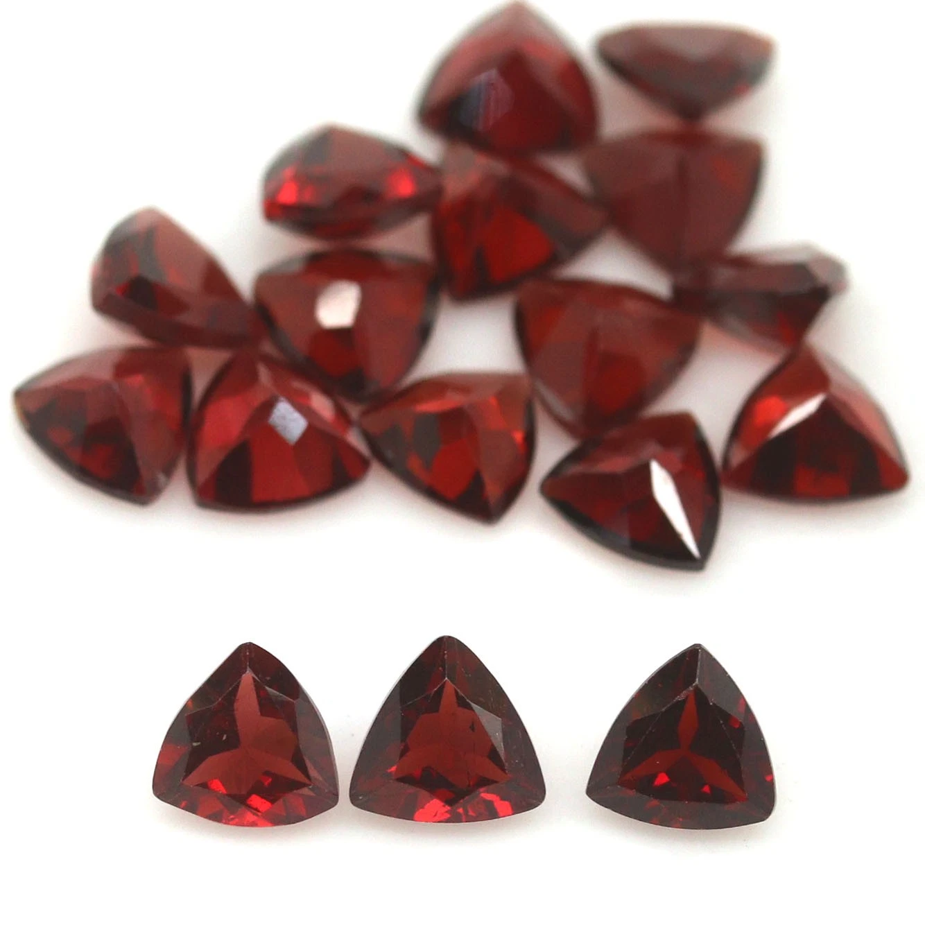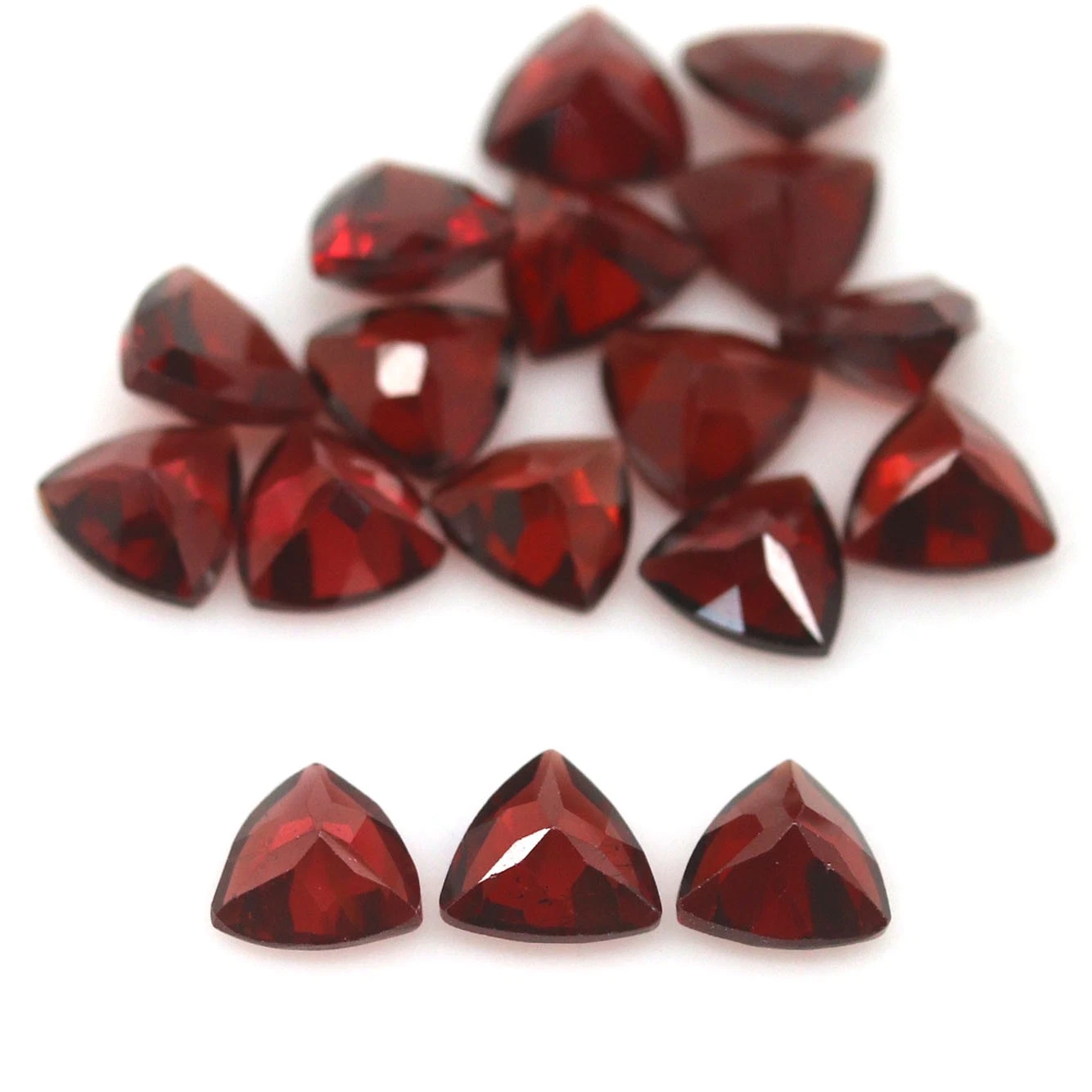 Összesen 14.48 karátos, 17 darabos, háromszög formájú, természetes pirop gránát drágakő szett, méretük: 6 x 6 x 3.4 - 6 x 6 x 2.6 mm. Szinte teljesen tiszták, illetve szemre tiszta drágakövek.