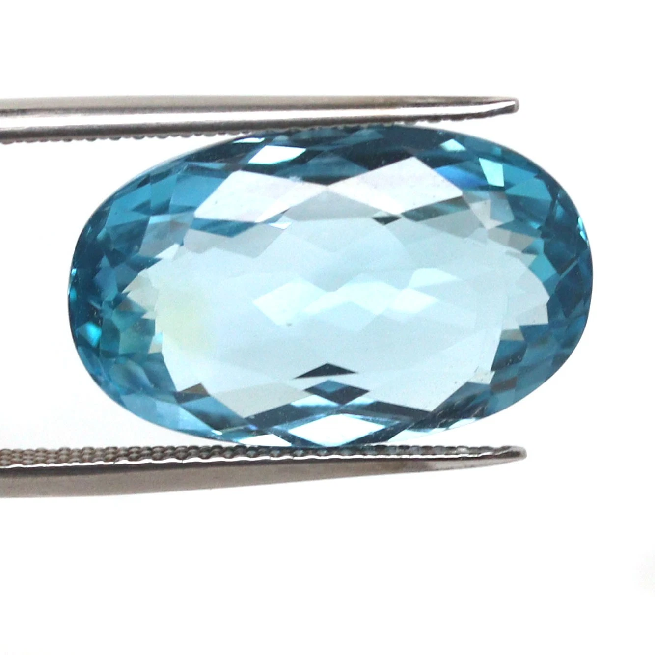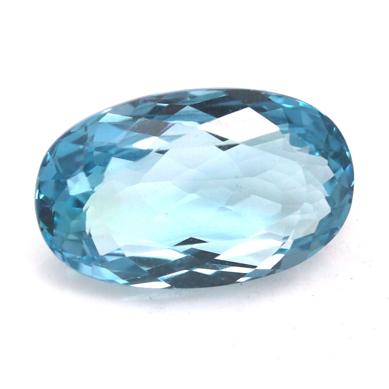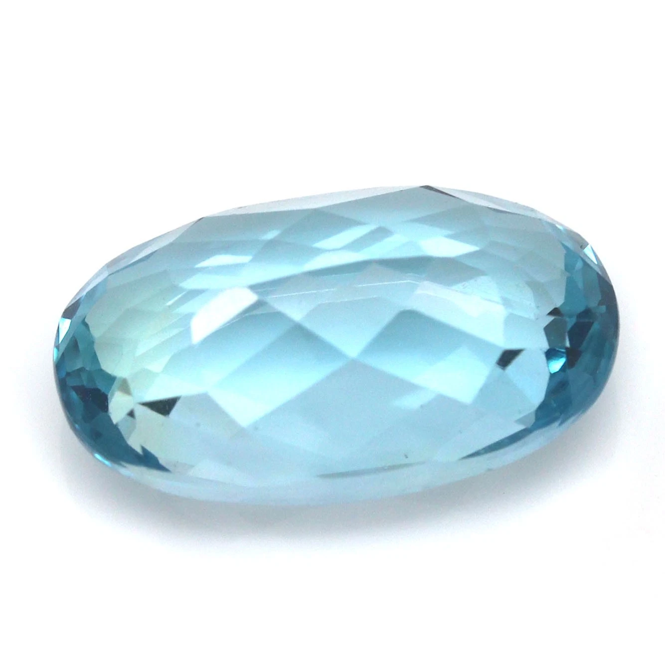 15.56 karátos, VVS tisztaságú, párna formájú, briliáns csiszolású, természetes, kezelt égszínkék topáz foglalatlan drágakő. Mérete: 11.8 x 19.2 x 7.4 mm.