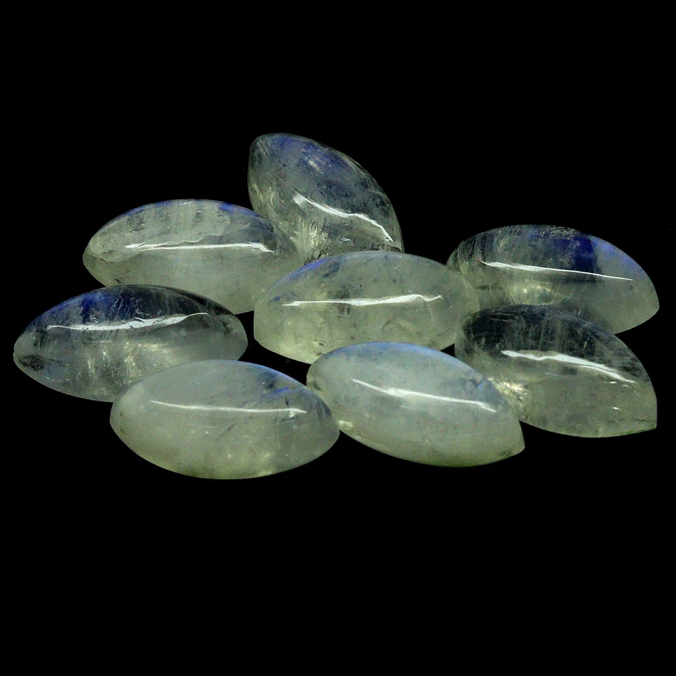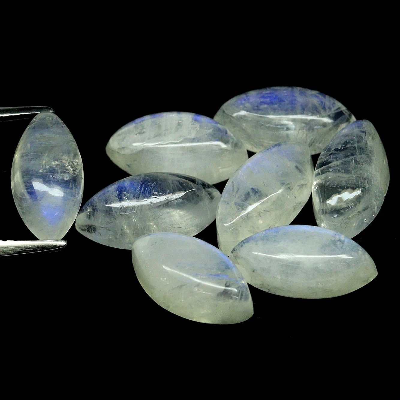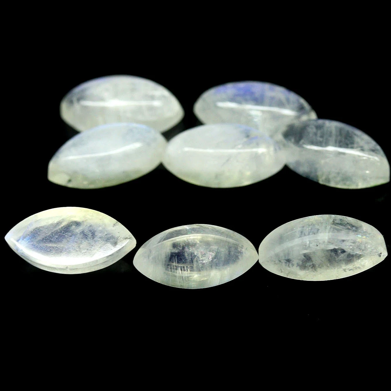 19.28 karátos, 8 darabos, kaboson csiszolású, természetes, kezelésmentes holdkő drágakő szett. Mérete: 6.2 x 12.0 x 4.5 - 6.0 x 1.7 x 4.3 mm.