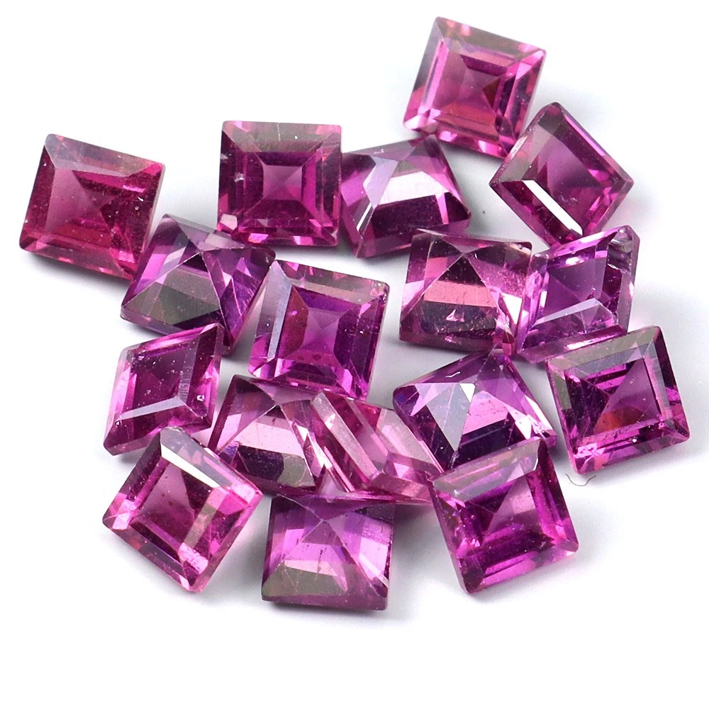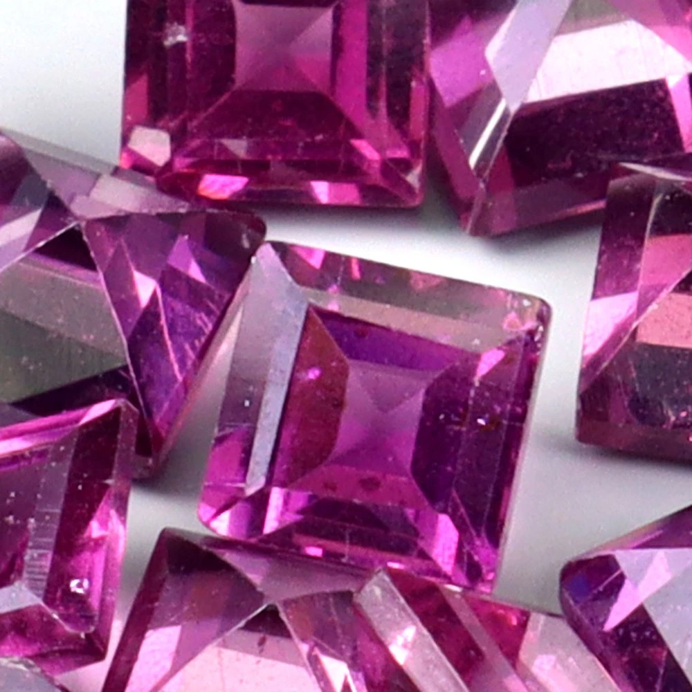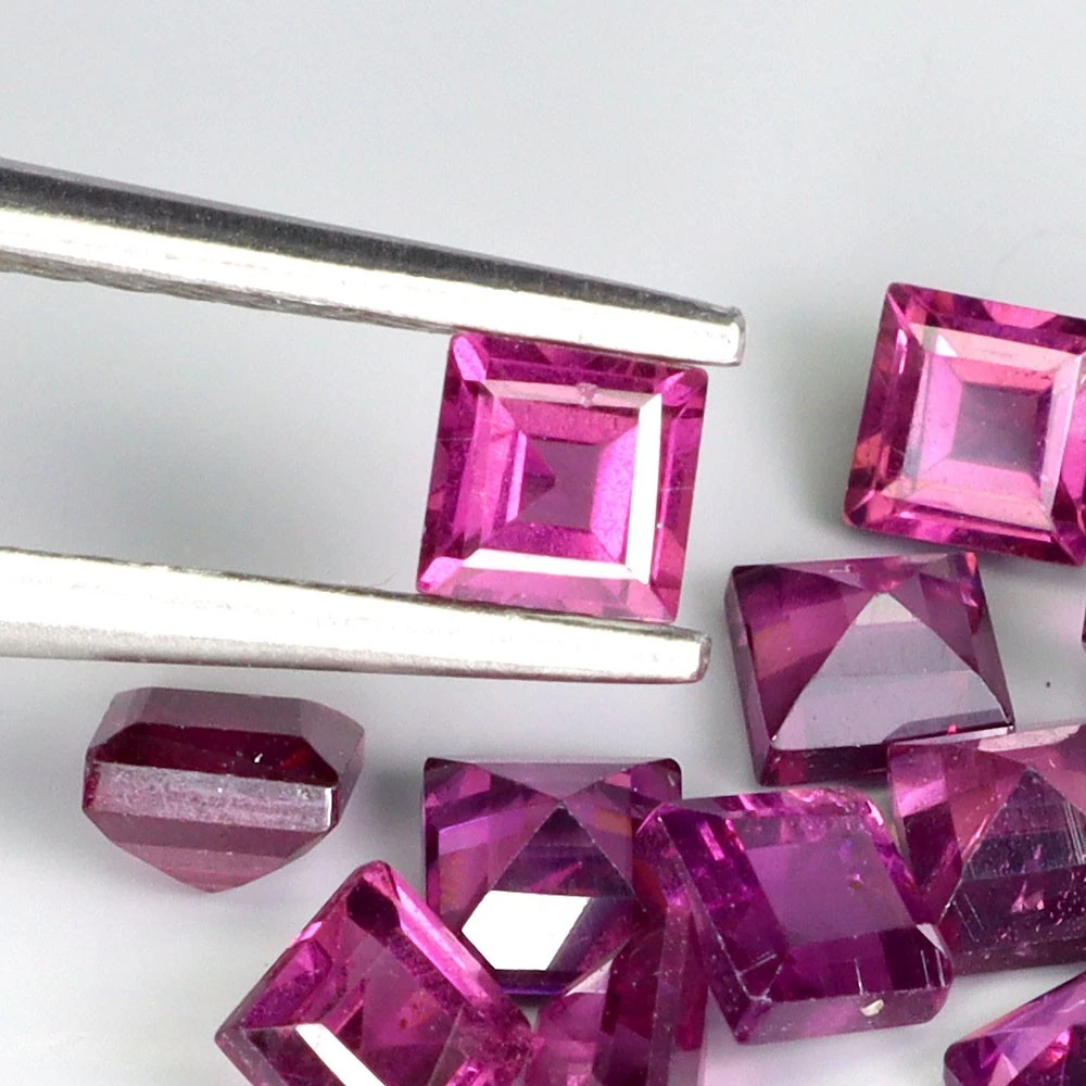 4.15 karátos, 17 darabos, négyzet formájú, lépcsős csiszolású (princessz forma), természetes, foglalatlan, málna színű rhodolit-gránát drágakő szett. Kiváló minőség.