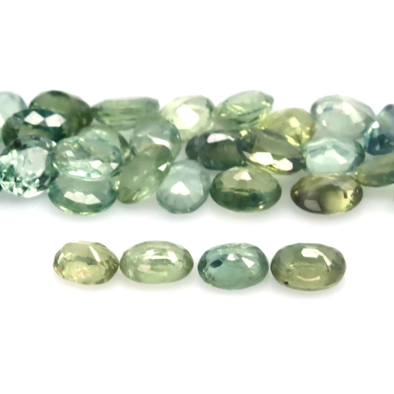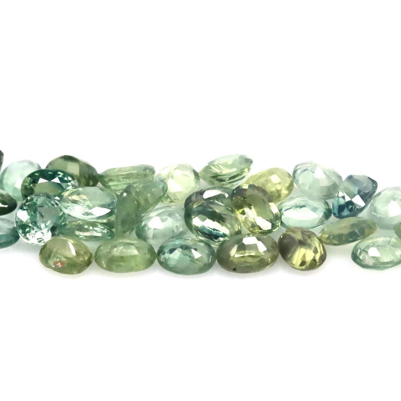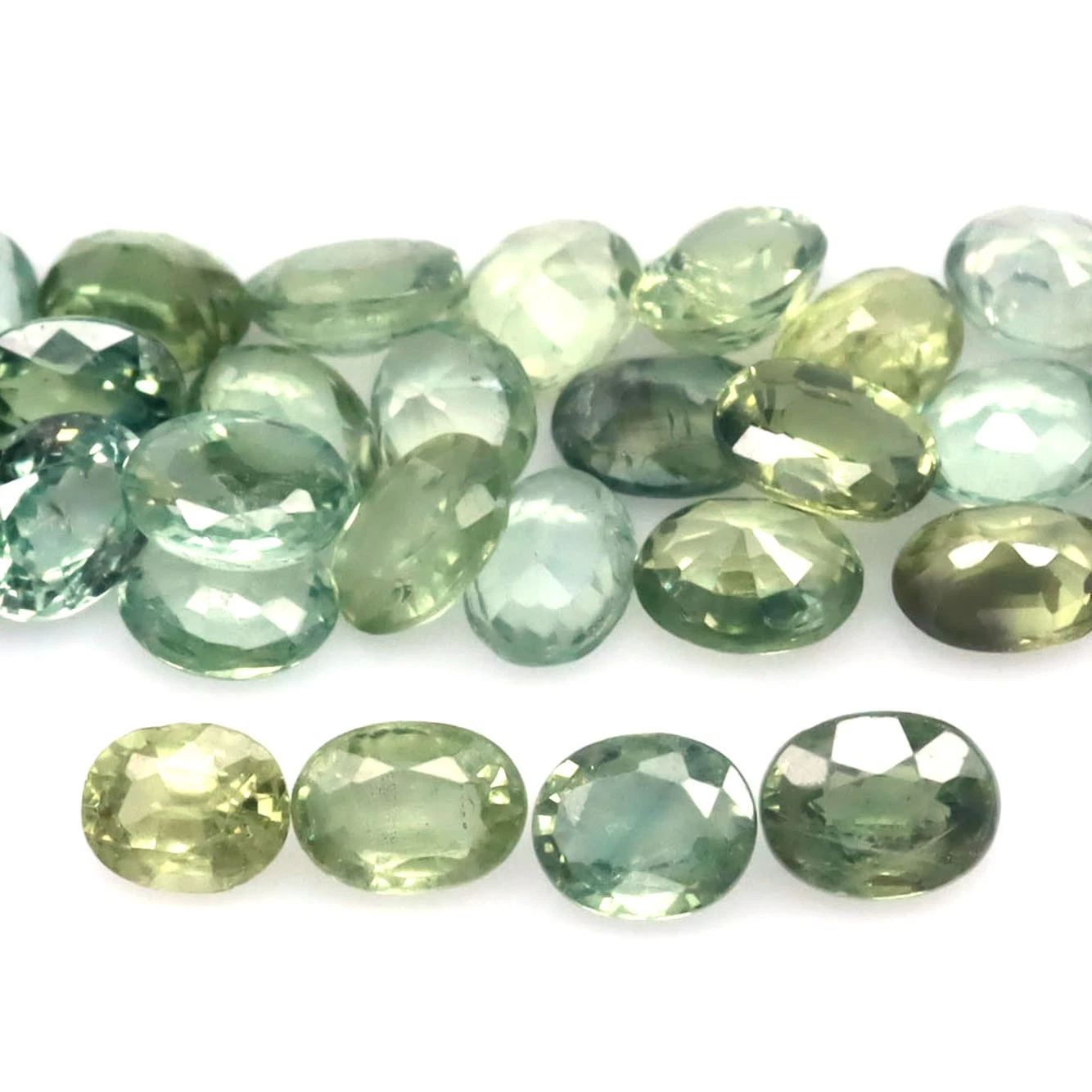 6.45 karátos, 34 darabos, ovális formájú, lépcsős (vegyes) csiszolású, természetes (tradicionálisan hőkezelt), foglalatlan, zöld - sárgás zöld színű, madagaszkári zafír drágakő szett. Átlátszó minőség.
