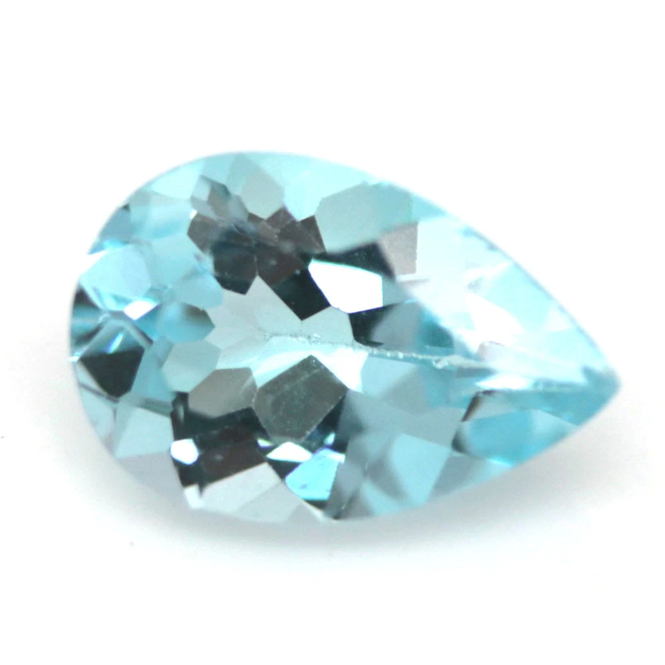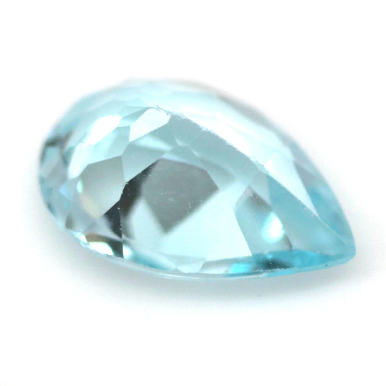 6.71 karátos, csepp formájú, briliáns csiszolású, természetes, kezelt égszínkék topáz drágakő. Mérete: 10.3 x 15.3 x 6.5 mm.