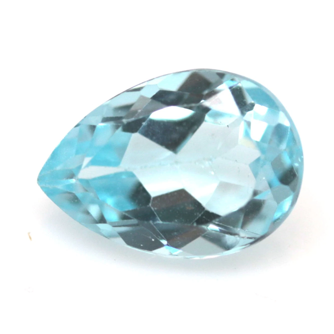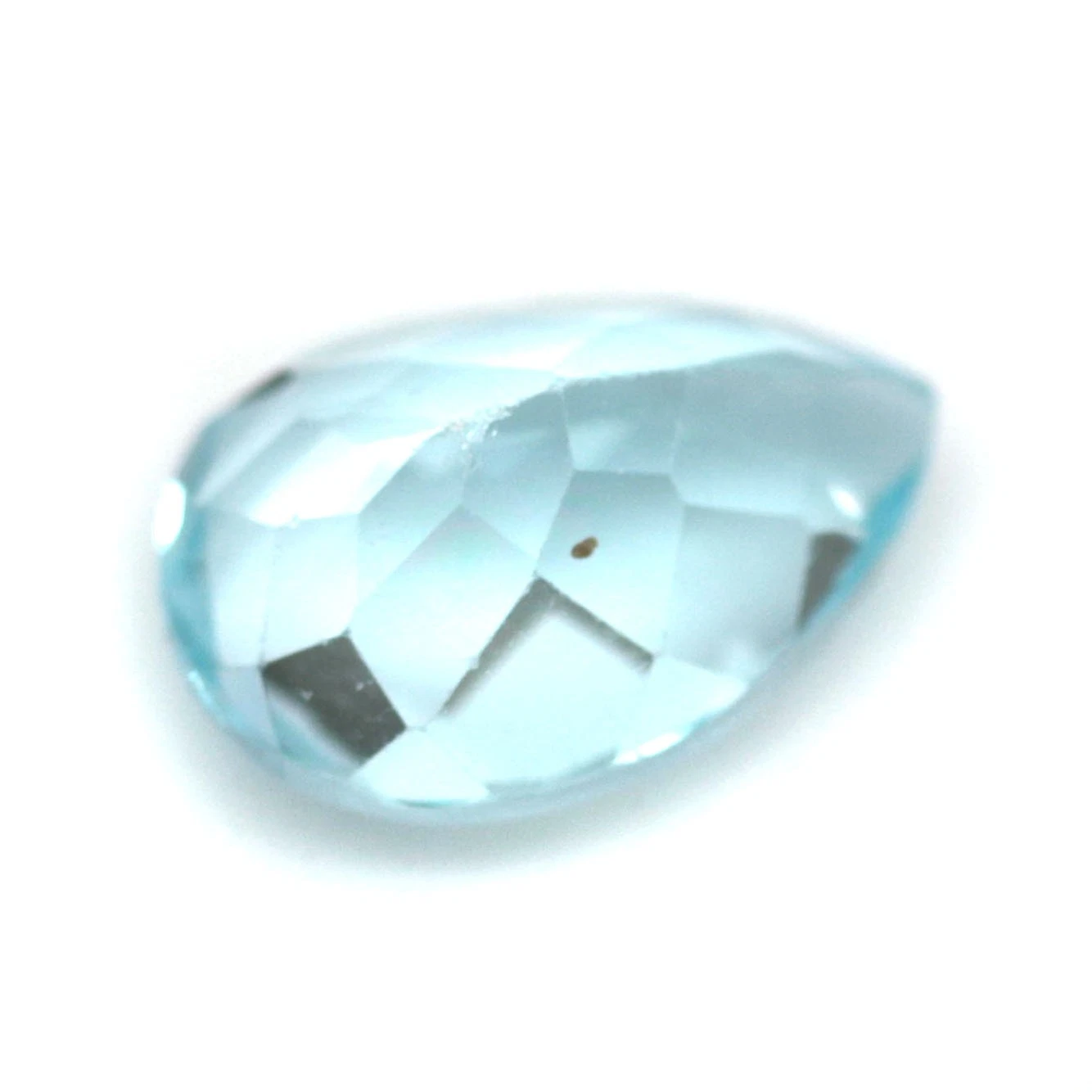 7.21 karátos, csepp formájú, briliáns csiszolású, természetes, kezelt égszínkék topáz drágakő. Mérete: 10 x 14 x 6.5 mm.
