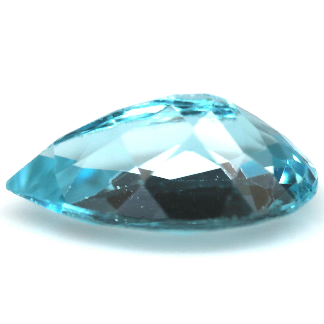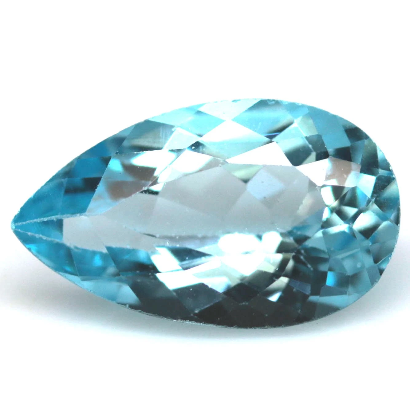 8.09 karátos, csepp formájú, briliáns csiszolású, természetes, kezelt égszínkék topáz drágakő. Mérete: 10.1 x 16.9 x 6.9 mm.