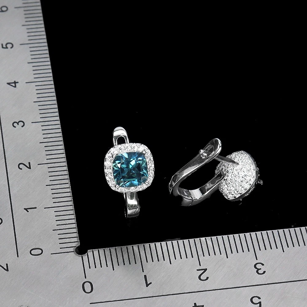 925-ös ezüst fülbevaló természetes (kezelt), 6 mm-es, párna alakú, briliáns csiszolású londoni kék topáz drágakővel. Az ékszer 14 karátos fehér arannyal van bevonva.
