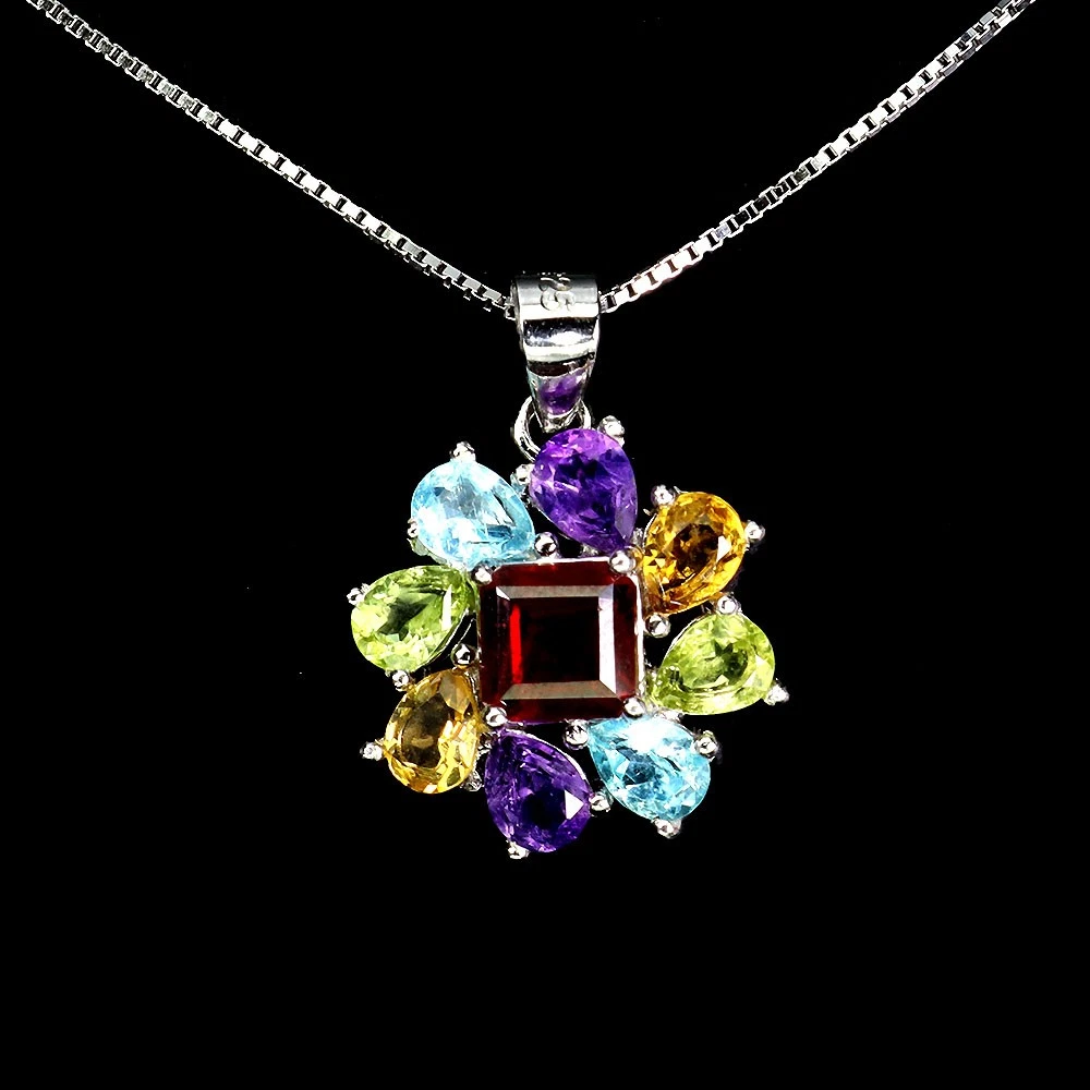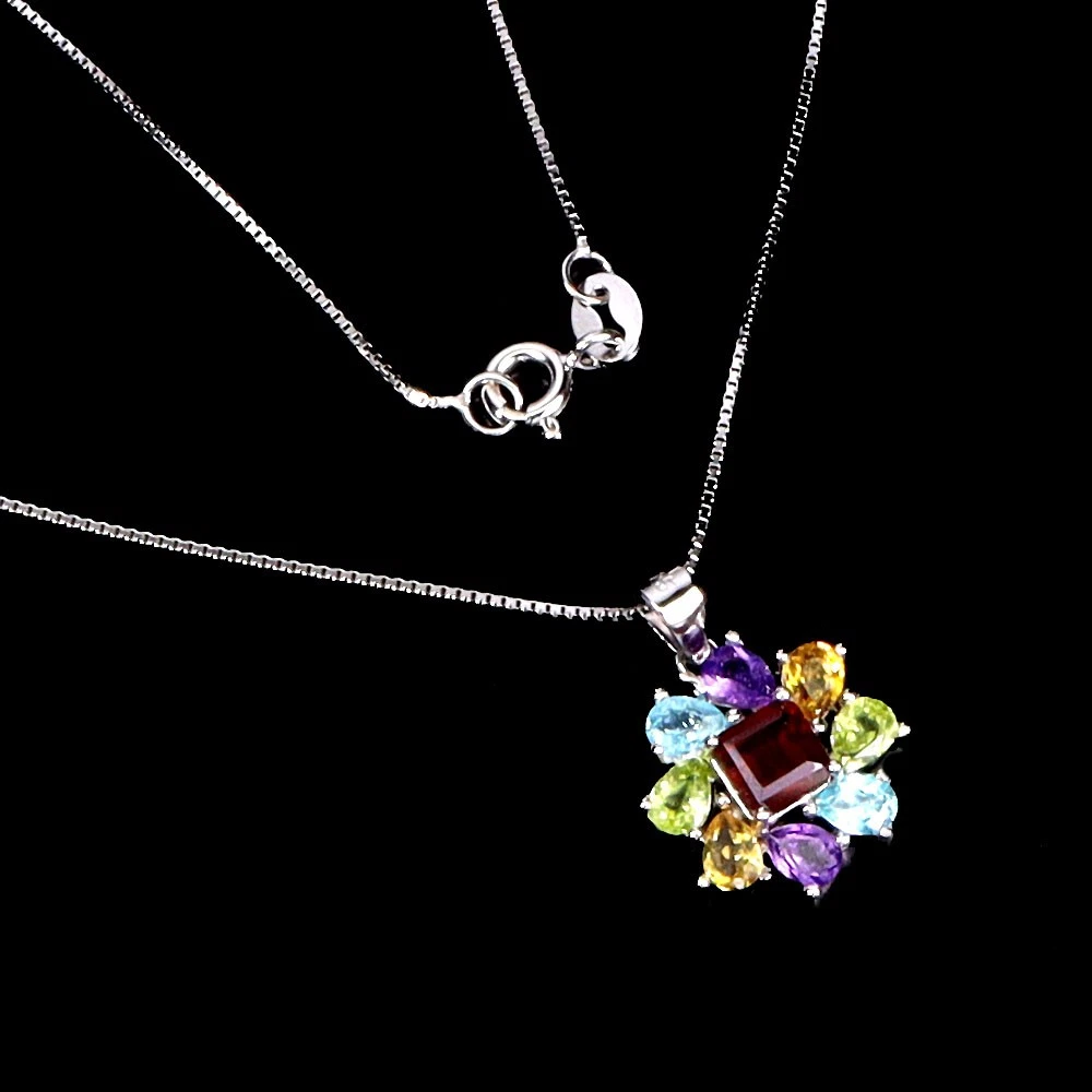 925-ös finomságú ezüst medál, természetes, színes drágakövekkel. A medál középen négyzet alakú 5 mm-es gránát, és csepp alakú, 4 mm-es ametiszt, citrin, topáz, peridot drágakövek díszítik. A medálhoz lánc is tartozik. Az ékszer 14 karátos fehér arannyal van bevonva.