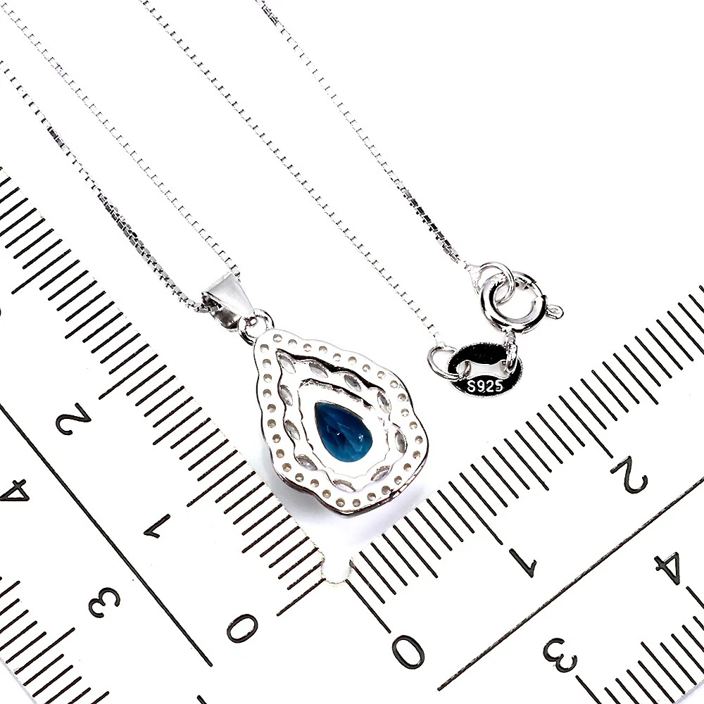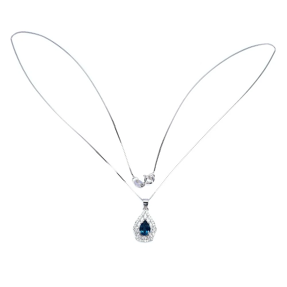 925-ös ezüst medál 7 x 5 mm-es "londoni kék" topázzal (kezelt). Az ékszer 14 karátos fehér arannyal van bevonva. Az ékszerhez 45 cm hosszú 925-ös finomságú ezüst lánc is tartozik.